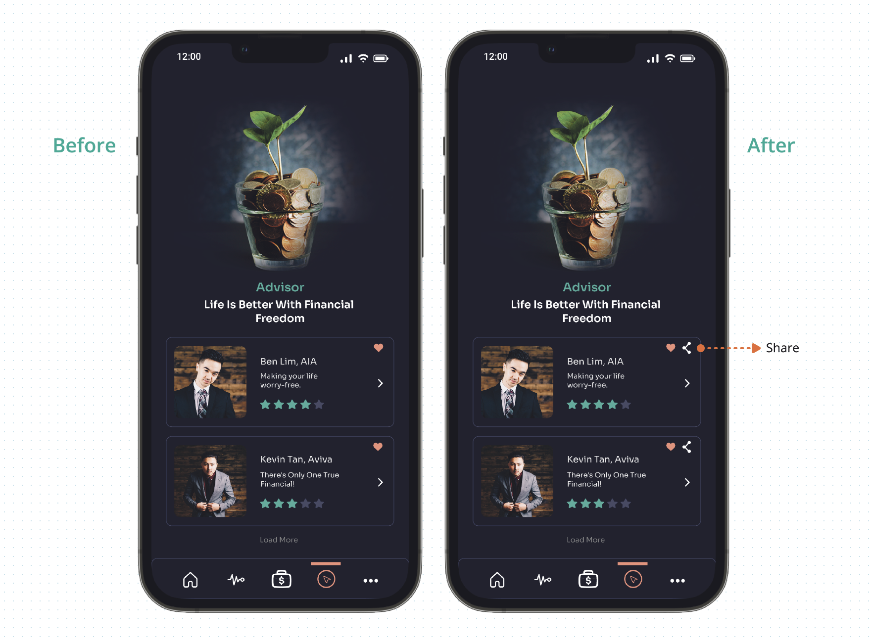 Solution: Users can share the advisor. A high chance to lead them to recommend the advisor to their friends and family can increase the number of sign-ups, platform usage, and traffic.